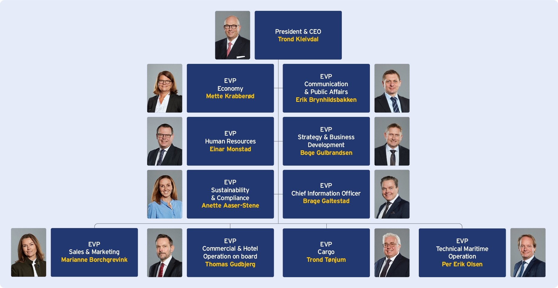 Color Line is organised into four business areas and six staff and support functions. Each area is represented by an Executive Vice President in the Group Executive Management, which is led by Color Line’s President and CEO. While the Executive Vice Presidents have overall responsibility for the four business areas, the individual staff and support functions are responsible for managing and overseeing their respective areas of responsibility, as well as supporting the business areas, the President and CEO, and the Board of Directors.