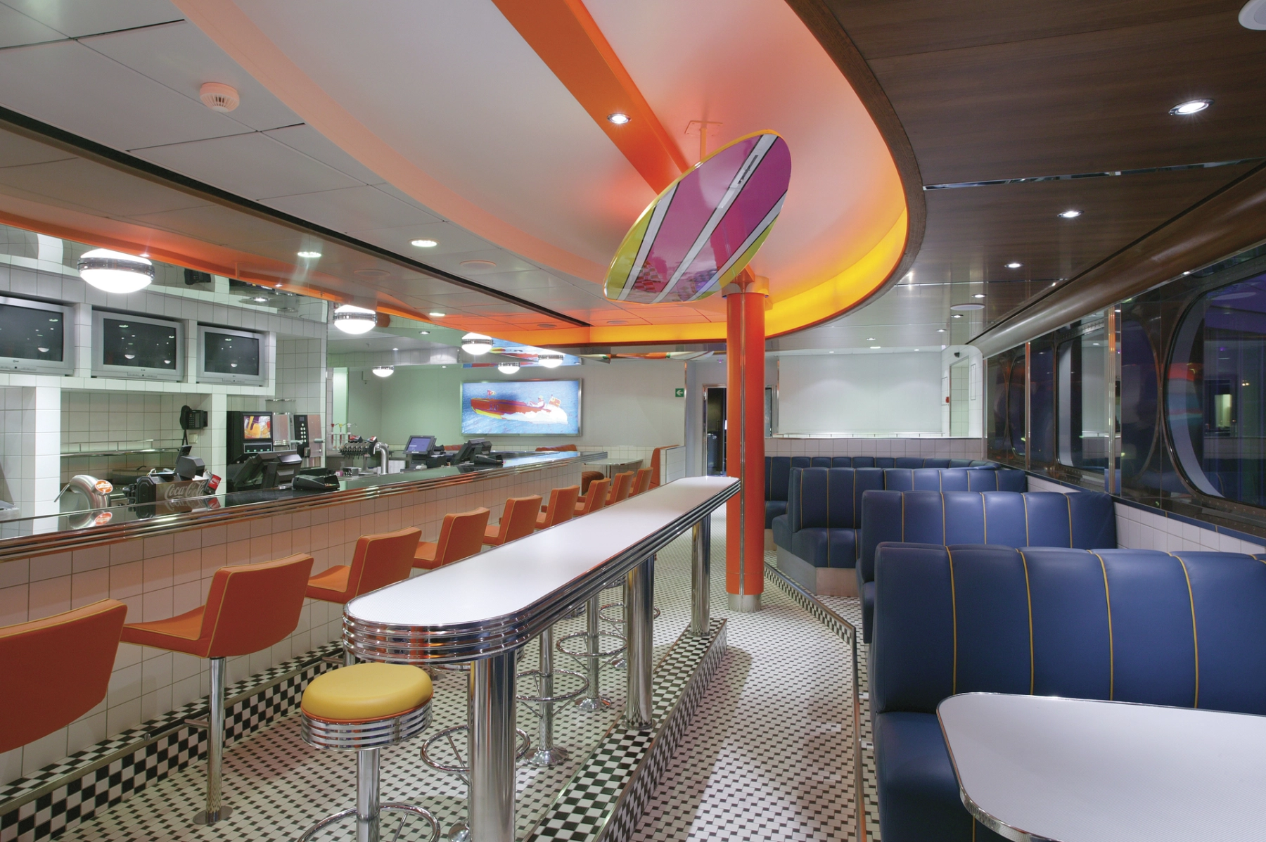 At the Sports & Burger Bar, you can enjoy juicy burgers, hot dogs, and crispy fries. This is a popular spot, and during the summer season there is direct access to the sun deck with outdoor seating.
